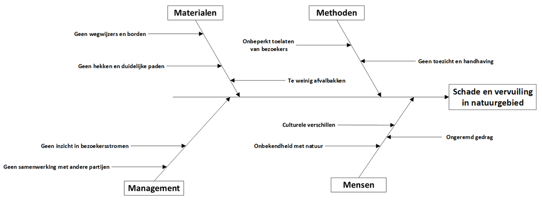 In dit Ishikawamodel is te zien hoe de verschillende mogelijke oorzaken gegrepeerd zijn rond enkele thema’s: de materialen, dus de fysieke inrichting van het park, de methoden, dus de manier van werken bij het ontvangen en bejegenen van de gasten, de manier waarop het management omgaat met de markt en de andere spelers op het gebied van natuurbeheer en de eigenschappen van de mensen die het park bezoeken.